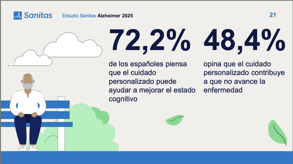 Según el Estudio Sanitas “El Alzheimer en España: percepción social sobre la enfermedad y los cuidadores”, nueve de cada diez personas creen que hace falta más información para los cuidadores de personas con Alzheimer. Además, el 64% de los españoles considera que, en fases avanzadas, lo mejor es que la persona reciba atención en una residencia especializada, un 32,6% opina que los cuidados se pueden prestar en casa y solo un 3% piensa que debería encargarse la familia por completo.