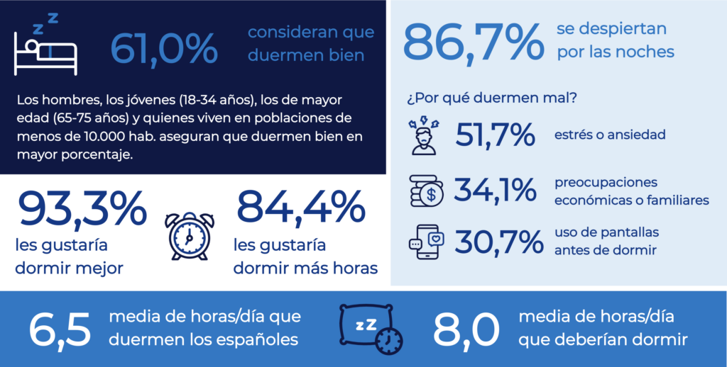 Entre los efectos más comunes del déficit de sueño se encuentran el cansancio persistente (78,2%), la falta de energía (58%) y la irritabilidad (43,2%). Las principales causas: el estrés (51,7%), las preocupaciones económicas o familiares (34,1%) y el uso excesivo de pantallas antes de dormir (30,7%).